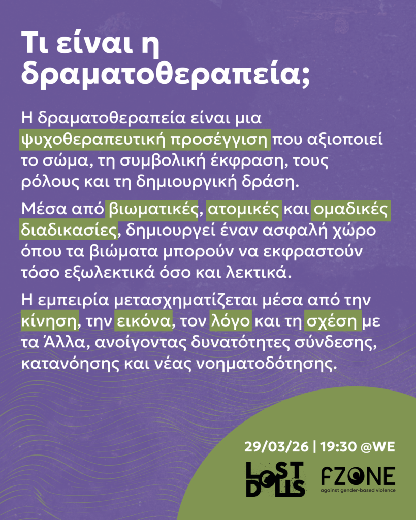 Ο στόχος του εργαστηρίου είναι να έρθουμε σε μια πρώτη επαφή με τη δραματοθεραπεία ως θεραπευτική διαδικασία, η οποία αξιοποιεί το σώμα, τη δημιουργικότητα και τη συμβολική έκφραση ως μέσα κατανόησης και επεξεργασίας του τραύματος. Πρόκειται για μια προσέγγιση που δεν περιορίζεται μόνο σε εξωλεκτικούς τρόπους, αλλά επιτρέπει στον λόγο να αναδυθεί μέσα από την εμπειρία, την κίνηση και τη σχέση, δημιουργώντας χώρο για σύνδεση, νοηματοδότηση και μετασχηματισμό του βιώματος, σε ατομικό και συλλογικό επίπεδο. Η δραματοθεραπεία αποτελεί βασικό εργαλείο προσέγγισής στην FZONE, στηρίζοντας την φροντίδα και την ενδυνάμωση.