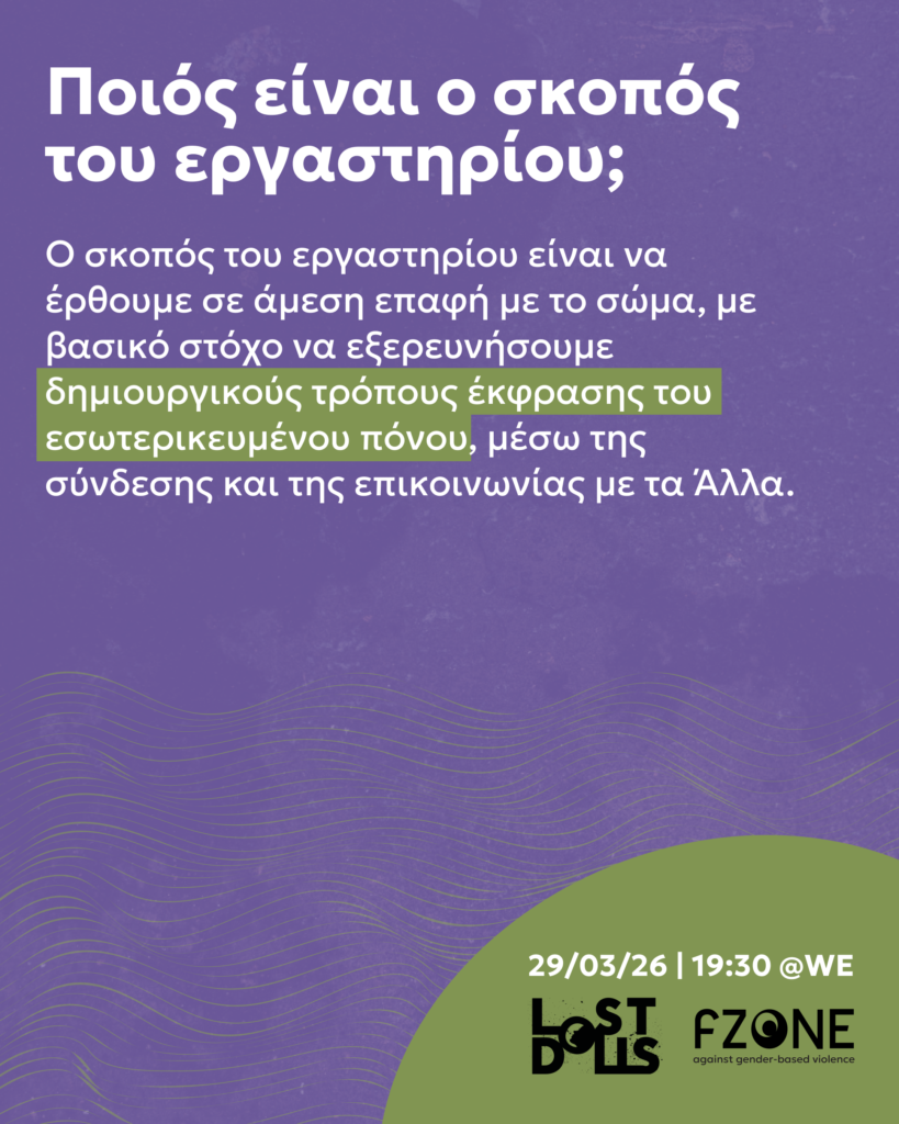 Στο εργαστήριο ερχόμαστε σε επαφή με το σώμα, τον εσωτερικευμένο πόνο και τη συλλογική επεξεργασία του τραύματος μέσα από την κίνηση και την τέχνη. Μέσα από σωματικές ασκήσεις, ενεργητική ακρόαση και καλλιτεχνική δημιουργία, τα συμμετέχοντα καλούνται να αναγνωρίσουν και να εκφράσουν αισθήσεις έντασης ή πόνου, να μεταφράσουν βιώματα σε εικόνες και σωματικά «αγάλματα» και να πειραματιστούν με επανορθωτικές κινήσεις που ανοίγουν νέους τρόπους κατανόησης και επικοινωνίας.